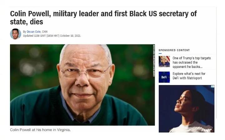 据美国有线电视新闻网(CNN)消息,美国首位黑人国务卿、前美军参谋长联席会议主席、共和党人科林鲍威尔因新冠并发症已于18日去世,终年84岁。报道称,科林鲍威尔的家人在脸书上公布了他的死讯,并称他死于新冠并发症,他此前已完全接种新冠疫苗。